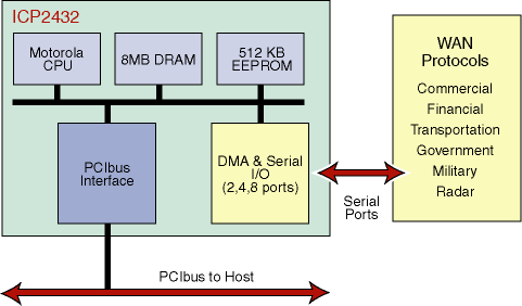 The ICP2432 functions as a front end processor for real-time, mission-critical applications and off-loads high-speed data communications tasks which otherwise consume host processor capacity. The programmability and flexibility of the ICP2432 ensures that it can adapt as connectivity requirements change with the addition of protocols, clients, or devices.